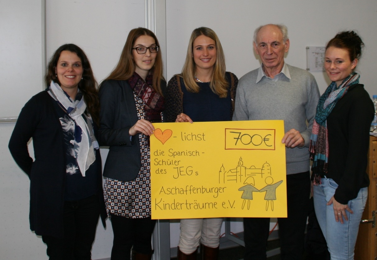 So konnte der Verein Aschaffenburger Kinderträume ein Spendenscheck über 700 Euro überreicht werden. Die verbleibenden 800 Euro gingen an die "Deutsche Knochenmark Spenderdatei" (DKMS), da im Januar 2016 eine Registrierungsaktion am Julius Echter Gymnasium realisiert wurde, bei der sich zahlreiche Schüler und Lehrer des JEG in der DKMS-Spenderdatei eintragen ließen.