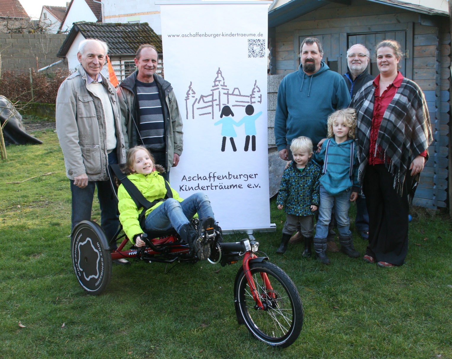 von links: Lothar Reichert und Thomas Treindl (Vorsitzende Kinderträume), Tochter Beate Glaser auf dem Fahrrad, Sohn Arthur, Florian Glaser, Sohn Moritz, Horst Sauerwein (Fahrradhändler aus Großumstadt) und Catharine Glaser